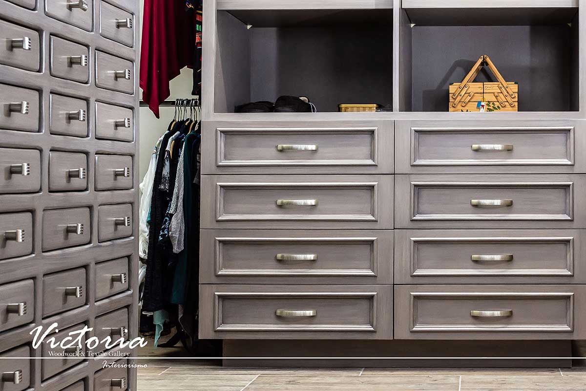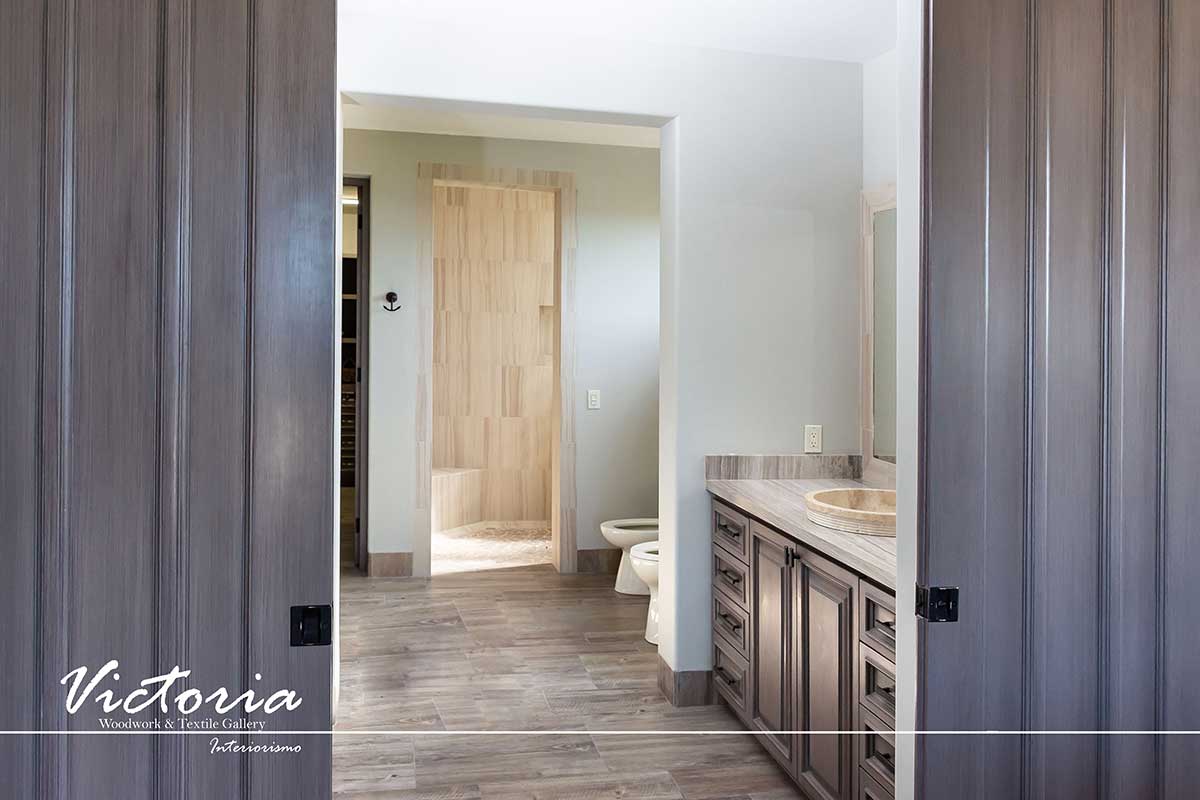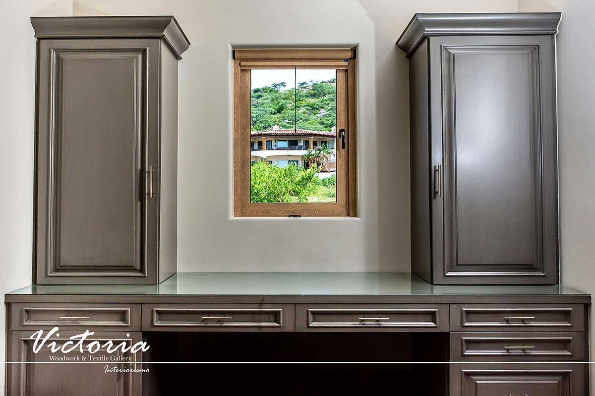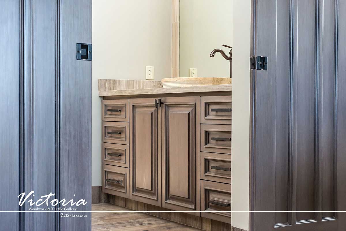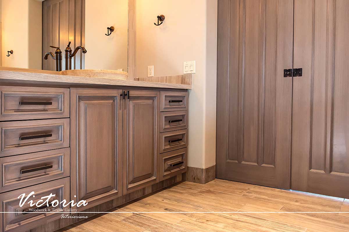 Proyecto de carpintería fina. Cocina integral | Lavandería | Vanitys | Closets | Oficina | Alacena | Puertas de intercomunicación. Madera de cedro | Terminación laqueado-patinado.